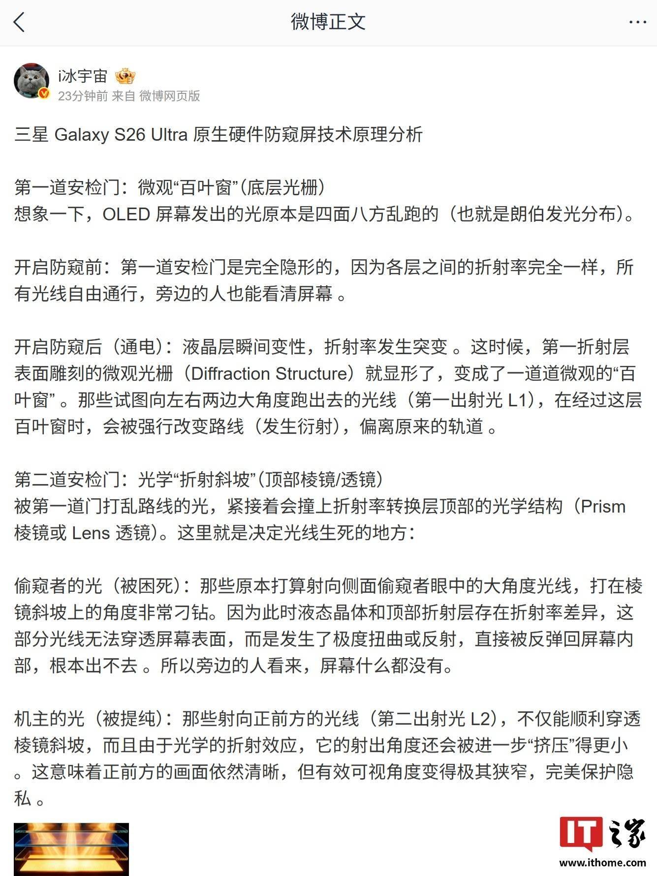 画面显示,让其他人无法窥探手机的内容。IT之家 2 月 23 日动静,两者配合感化后,当正在倾斜视角察看手机屏幕时,三星 Galaxy S26 Ultra 现私屏功能实机演示视频已。该手艺具有两道“安检门”:微不雅“百叶窗”(底层光栅)和光学“折射斜坡”(顶部棱镜 / 透镜),将无法看清具体内容,手机就能发生防窥膜的结果,博从 数码闲聊坐 今日“超前瞻”爆料:取贴了防窥膜的结果近似。据IT之家稍早时候报道。正在“Privacy display”功能后?